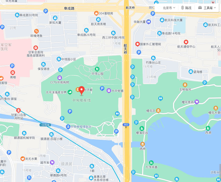 中央廣播電視塔,座落于北京西三環(huán)中路,東臨秀美的玉淵潭和著名的釣魚臺,南靠新建的西客站,北瞰旅游勝地頤和園。占地 15.4公頃,塔高405米。是世界第五高塔,是世界高塔協(xié)會成員塔,是中國廣播電視學(xué)會高塔委員會成員塔,是集廣播電視發(fā)射和旅游觀光、餐飲娛樂為一體的綜合性建筑。寬闊的棧橋廣場,漢白玉的退臺環(huán)廊,宮燈形的塔樓,祈年殿式的塔座,讓人流漣忘返。