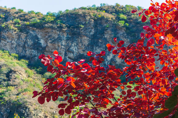 坡峰嶺景區(qū)春天時黃櫨花開,"三千粉色,花明如繡",滿樹毛絨的粉紅色黃櫨花傾灑在山谷中,層層迭迭,如粉色霧靄,置身其中如夢似幻。秋天時漫山紅葉,"紅葉綠中游,彩練當空舞",種類豐富的植物資源使這里成為流動的色彩海洋,猶如一幅波瀾壯闊的紅葉畫卷。