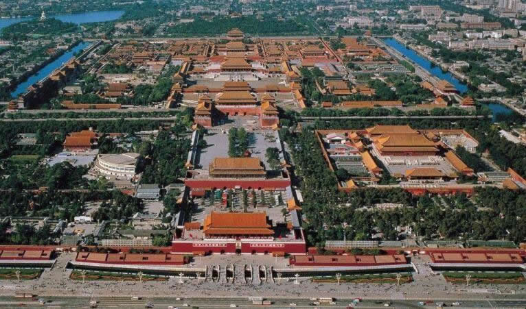 故宮宮殿是沿著一條南北向中軸線(xiàn)排列,三大殿、后三宮、御花園都位于這條中軸線(xiàn)上。并向兩旁展開(kāi),南北取直,左右對(duì)稱(chēng)。這條中軸線(xiàn)不僅貫穿在紫禁城內(nèi),而且南達(dá)永定門(mén),北到鼓樓、鐘樓,貫穿了整個(gè)城市。
