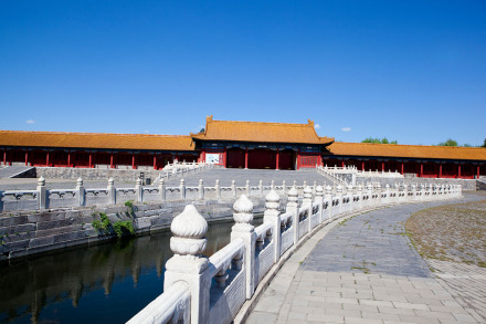 太和門(mén)前有面積約26000平方米的廣場(chǎng),內(nèi)金水河自西向東蜿蜒流過(guò)。河上橫架五座石橋,習(xí)稱(chēng)內(nèi)金水橋。廣場(chǎng)兩側(cè)是排列整齊的廊廡,習(xí)稱(chēng)東、西朝房,并有協(xié)和門(mén)(明代稱(chēng)會(huì)極門(mén))和熙和門(mén)(明代稱(chēng)歸極門(mén))東西對(duì)峙。東側(cè)廊廡在明代用作實(shí)錄館、玉牒館和起居注館,清代改作稽察欽奉上諭事件處和內(nèi)誥敕房。西側(cè)廊廡在明代為編修《大明會(huì)典》的會(huì)典館,清代改為繙書(shū)房和起居注館。