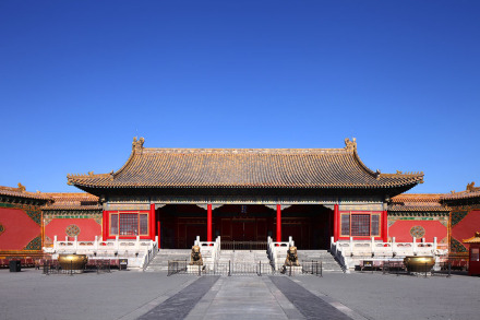 在故宮“內(nèi)庭”最后面。重檐廡殿頂。坤寧宮是明朝及清朝雍正帝之前的皇后寢宮,兩頭有暖閣。清代改為祭神場(chǎng)所。雍正后,西暖閣為薩滿(mǎn)的祭祀地。其中東暖閣為皇帝大婚的洞房,康熙、同治、光緒三帝,均在此舉行婚禮。