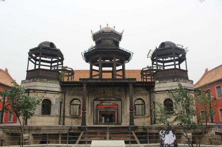 延禧宮為內(nèi)廷東六宮之一,建于明永樂(lè)十八年(1420年),初名長(zhǎng)壽宮。殿前有東西配殿各3間。后院正殿5間,亦有東西配殿各3間,均為黃琉璃瓦硬山頂。宣統(tǒng)元年(1909年)在延禧宮原址興工修建一座3層西洋式建筑——水殿。水殿四周浚池,引玉泉山水環(huán)繞。主樓每層9間,底層四面當(dāng)中各開(kāi)一門(mén),四周環(huán)以圍廊。隆裕太后題匾額曰“靈沼軒”,俗稱(chēng)“水晶宮”。1917年張勛復(fù)辟時(shí),延禧宮北部被直系部隊(duì)飛機(jī)投彈炸毀。