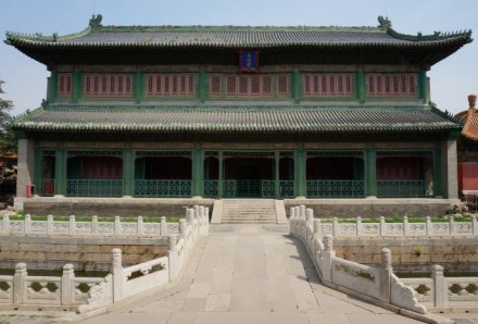文淵閣是文華殿后的藏書(shū)樓,乾隆四十一年(1776年)仿浙江藏書(shū)名樓“天一閣”建造。閣分上下兩層,黑色琉璃瓦覆頂,綠色琉璃瓦剪邊,色調(diào)深沉雅致,又寓含五行中黑色主水,以水克火的用意。閣內(nèi)藏《四庫(kù)全書(shū)》與《欽定古今圖書(shū)集成》,清代乾隆朝以后,除了皇帝來(lái)這里讀書(shū)外,也允許臣工和學(xué)士們來(lái)此查閱圖書(shū)。