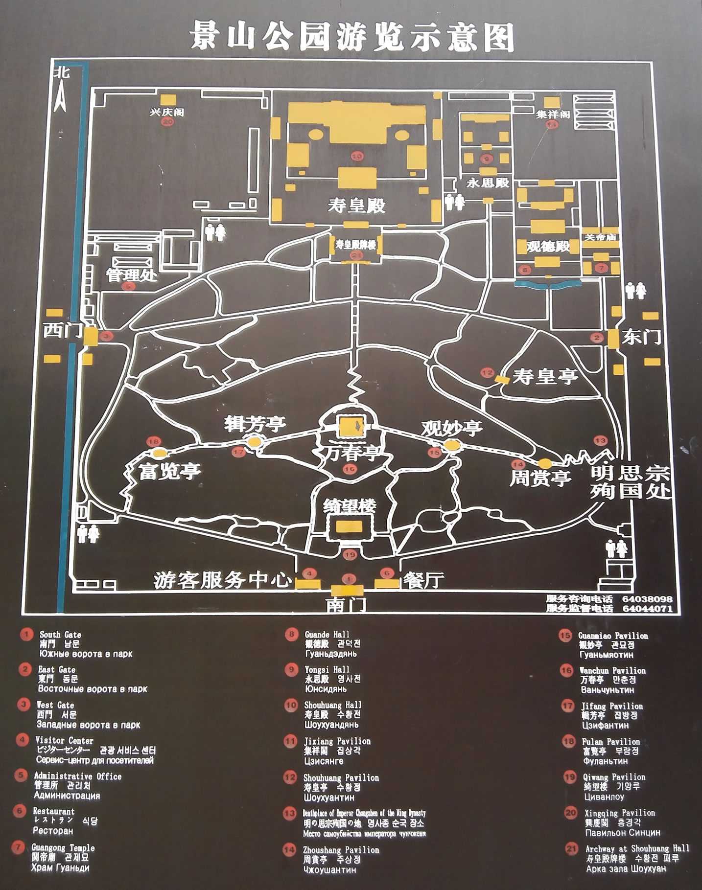 富覽亭:西側(cè)第一座亭?兹杆{(lán)琉璃筒瓦頂,紫晶色琉璃瓦剪邊,重檐圓攢尖頂。富覽亭建于乾隆十五年(1750年),為景山五方亭之一,與東側(cè)的周賞亭相對而建,兩座亭子的建筑形式和彩繪完全相同,為重檐圓攢尖頂,孔雀藍(lán)琉璃瓦覆頂,紫晶色琉璃瓦剪邊,亭高11.75米,建筑面積76.36平方米。富覽亭內(nèi)原供奉五方佛之一的不空成就佛,為鑄銅鎦金佛像。佛像于1900年(光緒二十六年)被八國聯(lián)軍劫去。不空成就佛是北方如來,又稱天鼓雷音佛、天鼓音佛、雷音王佛等名,在五智如來中代表 “成所作智”。 不空成就佛以大慈方便,使佛門修行者舍除懈怠貪欲,遠(yuǎn)離一切煩惱,從而道業(yè)精進(jìn),以大智慧成就一切如來事業(yè)與眾生之事業(yè)。