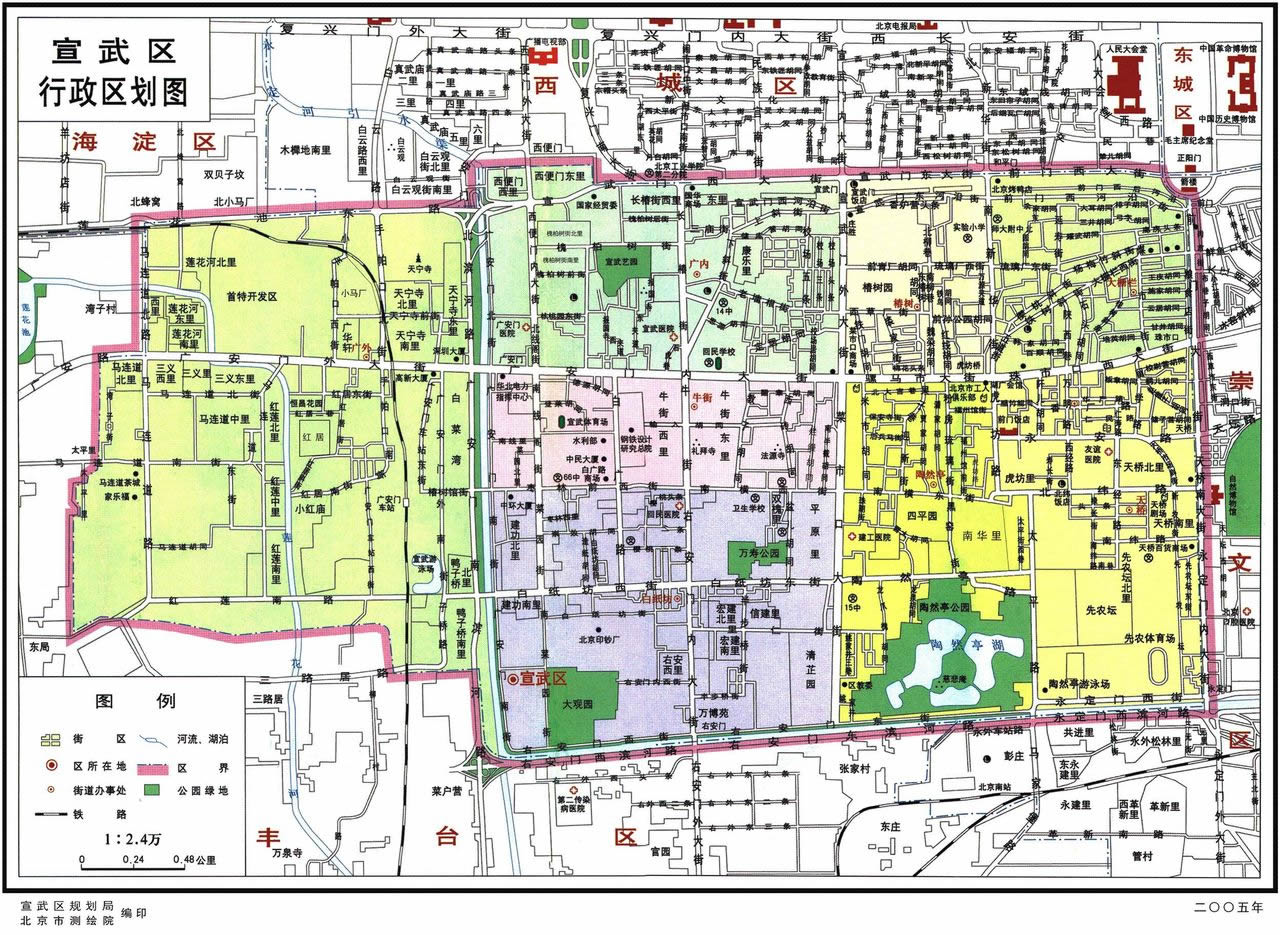 2005年,宣武區(qū)轄8個(gè)街道:白紙坊街道、大柵欄街道、椿樹(shù)街道、廣內(nèi)街道、廣外街道、牛街街道、陶然亭街道、天橋街道。共有108個(gè)社區(qū)。