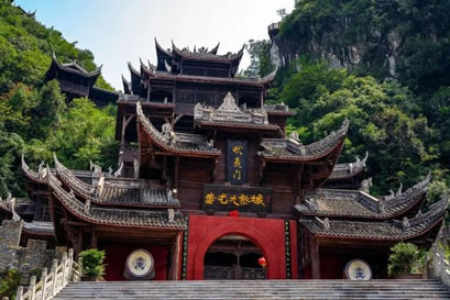 九道門是蚩尤九黎城的標(biāo)志性建筑,是進(jìn)入景區(qū)的主要通道。沿山脊建有3座石門、3座木門、3座磚木結(jié)構(gòu)門,每座牌門建筑錯(cuò)落有致,造型各異,以九黎部落命名,分別名為畎夷門、于夷門、方夷門、黃夷門、白夷門、赤夷門、玄夷門、風(fēng)夷門、陽夷門。采用金、木、水、火、土天地五行作為用材和風(fēng)水的象征,面朝北方。每一座牌門上都雕刻有苗族民俗文化、歷史故事和民間吉祥的圖騰。“九道門”是世界上唯一的九進(jìn)門庭,已被列入上海大世界基尼斯之最。