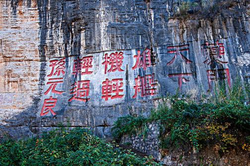 瞿塘峽摩崖石刻,位于重慶市奉節(jié)縣瞿塘峽口南岸白鹽山下的陡峭巖壁上,立面面積600平方米,共有自宋代以來的題刻十三幅,綿延180余米,鐫刻時間先后延續(xù)長達(dá)七百余年。所有題刻均為陰刻,篆、隸、行、楷皆備,內(nèi)容涉及頌德、詠史、觀景等。表現(xiàn)出了書法的原有韻味,具有極強(qiáng)的藝術(shù)感染力,又由于地處三峽要沖,給整個長江三峽增添了濃厚的文化色彩。