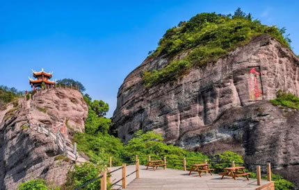 冠豸山屬于丹霞地貌,其自然形態(tài)之美在于山之奇險與幽秀,水之清冽與甘甜。遠(yuǎn)望冠豸,山并不高。登上盤旋的山路,走過“蒼玉峽”,來到“半云亭”時,便自然產(chǎn)生“云層覺路嶺千尋”的感覺。丹梯云棧緊與半云亭相連,峭壁之上,開鑿磴道,垂直如梯,右邊是懸崖,巖色赤潤,左邊是絕谷,谷深萬丈。行走在云棧之間,有如行走在古木蒼郁的樹梢之上,行走在半空的云霧之間。