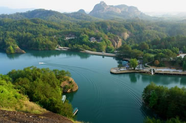 共有蜘蛛巖、水上金字塔、鄂魚峰、金鼠巖、九龍獻(xiàn)瑞、佛洞、八仙巖等景點20多處,是冠豸山風(fēng)景區(qū)又一顆璀璨明珠。 九龍湖內(nèi)港汊眾多,彎彎曲曲,處處是“水上迷宮”,曲徑通幽,是一個珊瑚狀的湖泊,而主要有四大龍溏坑、飛龍坑、九龍灣坑和碧螺坑。主要景點有: 九龍獻(xiàn)瑞:位于大壩口,九條如巨龍走勢的山脈齊聚于次,而其中一條飛龍最為生動形象,蜿蜒曲伸,猶如從天而降猛龍,正潛翔入海,栩栩如生。 金猴戲犬:大壩側(cè)一組丹霞石柱、石壁楊成一幅美妙、畫圖。正中石柱活象一位魁梧壯漢,為九龍湖守護(hù)神。在它的腳下是“金猴戲犬”圖,金猴激戰(zhàn)天兵天將,面對一群兇神惡煞的圍攻,騰身一躍,站于“哮天犬”尾巴上搔首弄姿,戲弄敵人。 如意壁:在一塊山崖下方,壁立平整,棱角分明。象一扇洞府山門。(也有人稱它為“無字碑”) 靈蚌含珠:一小山丘形似靈蚌,碩大豐滿,勃勃生機(jī),猶如正在孕育著無數(shù)個珠的蚌母。 飛龍顯身:九條獻(xiàn)瑞中,其一起在半腰中突然裸露出100余米長龍身。猶如正在它的敵人酣斗中突然顯出原形,威風(fēng)凜凜震懾對方。這是一道“丹霞山脊”也稱“石梁”,如攀登這段石梁比黃山“鯽魚背”更險更奇。