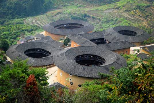 福建土樓產(chǎn)生于宋元,成熟于明末、清代和民國時期。土樓以石為基,以生土為主要原料,分層交錯夯筑,配上竹木作墻骨牽拉,丁字交叉處則用木定型錨固。福建土樓或方或圓,以圓為主,如珍珠般灑落在閩西南的綠水青山間。福建土樓遵循了“天人合一”的東方哲學理念,就地取材,選址或依山就勢、或沿循溪流,建筑風格古樸粗獷,形式優(yōu)美奇特,尺度適當,功能齊全實用,與青山、綠水、田園風光相得益彰,組成了適宜的人居環(huán)境以及人與自然和諧統(tǒng)一的景觀。