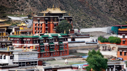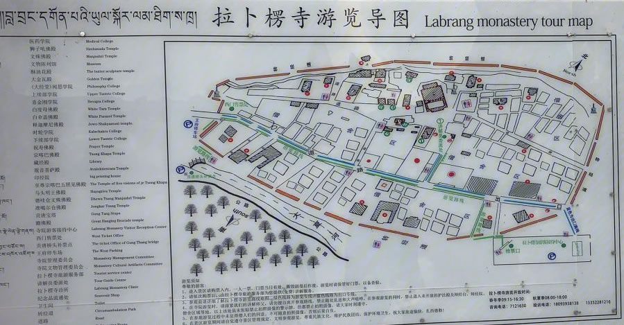 寺院坐北向南,占地總面積86.6萬(wàn)平方米,建筑面積40余萬(wàn)平方米,主要殿宇90多座,包括六大學(xué)院、16處佛殿、18處昂欠(大活佛宮。、僧舍及講經(jīng)壇、法苑、印經(jīng)院、佛塔等,形成了一組具有藏族特色的宏偉建筑群,房屋不下萬(wàn)間。