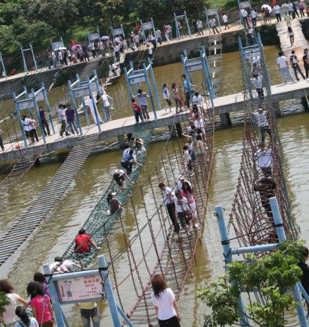 拓展訓(xùn)練基地占地面積10余畝,是深圳市青少年生存能力素質(zhì)教育基地,分為水上游樂區(qū)、高空拓展區(qū)與兒童游樂區(qū)。特別是水上游樂區(qū)涵蓋了霹靂滾桶、魔鬼車輪、木樁功夫橋和鐵鎖吊橋等有趣刺激拓展運動項目。您既可以在青山綠水中盡情呼吸新鮮空氣,又可以在動感十足的拓展項目中挑戰(zhàn)自我,體驗這一風靡全球的拓展運動帶給你的無限快樂。項目網(wǎng)羅: 霹靂滾桶、魔鬼車輪、秋千橋 、連環(huán)獨木橋 、木樁功夫橋、 空中獨木橋、園木云梯橋、鐵鎖晃橋、長板坡 、 云梯橋 、鐵鎖鋼絲橋 、天羅地網(wǎng)、云梯功夫橋 、鐵鎖吊橋、 木樁功夫橋、水上漂 、鐵鎖橋、 一線鐵鎖橋 一線鐵鎖橋 、九曲獨木橋 、踏水無痕 、向風起舞 、鐵甲四強等。