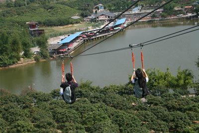 空中飛人滑索項目位于觀音廟后,依山勢而建,在果樹山林之間架起了一段全程300米、落差50米,每秒7.5米滑行速度的高空索道,在歷時40秒滑行時間中,游客在享受高空索道帶來驚險刺激體驗同時,可一覽園區(qū)秀美風景并,讓人回味無窮。