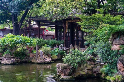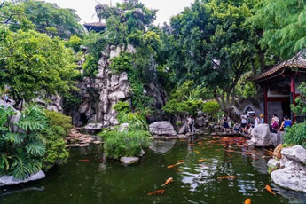 在花木配置方面,園內(nèi)花卉果木逾百種,除了嶺南園林常用的果樹(shù),還栽種了蘇杭園林特有的紫竹、枸骨、紫藤、五針?biāo)、金錢松、七瓜楓、羽毛楓等,并從山東等地搜集了龍順棗、龍瓜槐等北京樹(shù)種,其中銀杏、沙柳、紫藤、龍眼、水松等古木樹(shù)齡已百年有余。