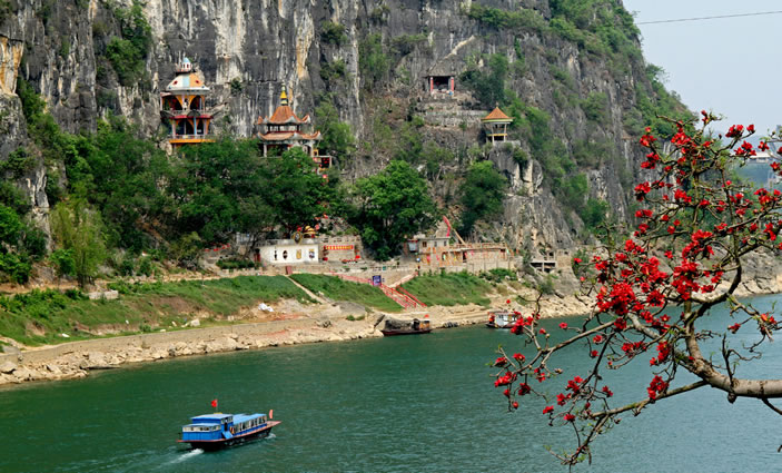 金雞巖位于縣城西北隅,坐落在架山腰間,瀕臨左江,與扶綏中學隔江相望。 [22]主洞面積40多平方米,高4米、內(nèi)設有金雞娘娘、斑民夫人、花公、花婆、花木蘭等塑像。洞口左側(cè)有伏波亭,右側(cè)有伏波將軍塑像。沿江岸有103級石階通往洞口。金雞巖為明代遺址。相傳金雞娘娘于此修道成正果,故名“金雞巖”。明代著名地理學家、旅行家徐霞客留下“三誤三返”游跡;清代名人劉宅俊在懸崖巖壁上刻鐫著“雞巖帆影”題詞;道光癸卯年記載著李佑會題刻銘詩。