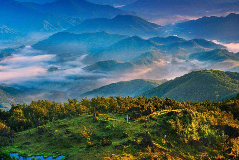 地貌 境內(nèi)地勢(shì)西北高東南低,主要是十萬大山和其支脈東山,以及一些零星山脈,山脈呈東北——西南走向,平面形狀略呈菱形,一般坡度35°—45°之間。北倚十萬大山,西北峻嶺林立,高峰挺拔,最高峰為板八村的久寶山,海拔1448米;中部山丘錯(cuò)雜,連綿起伏,東南是丘陵地帶,間有小塊平原。