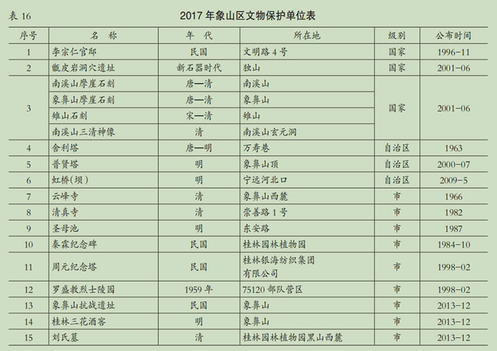 象山區(qū)有全國重點(diǎn)文物保護(hù)單位3個(gè),自治區(qū)級(jí)文物保護(hù)單位3個(gè),桂林市級(jí)文物保護(hù)單位9個(gè)。