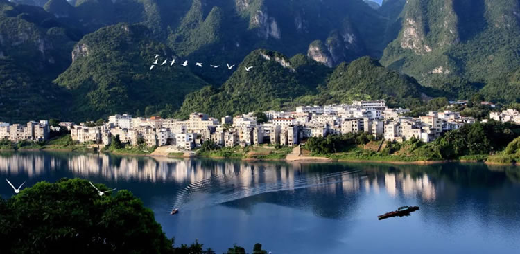 “紅水河第一灣”是國家AAAA級(jí)景區(qū),位于三石鎮(zhèn)板文村。紅水河在流經(jīng)東蘭縣板文村境內(nèi)拐了一個(gè)大彎,形成一個(gè)“U”字型的大峽谷,山環(huán)水繞,碧如玉環(huán),中間主峰如神龜靜臥,兩岸峰叢對(duì)稱排開,谷底河灘幾十個(gè)水譚或?qū)ΨQ、或連通,奇妙非常。山間林木翠綠蔥蘢,獼猴跳躍,百鳥爭(zhēng)鳴。在山頂上銅鼓觀景玻璃臺(tái)觀賞第一灣奇景,若在晨起碰到云霧天氣,霞光普照,霧繞神灣,幻若仙境。有詩描述:“一灣驚天下,回首造高峽,千山還壯美,奔流再出發(fā)!”該景區(qū)是紅水河的精華河段,是攝影、探險(xiǎn)、休閑度假的好地方。