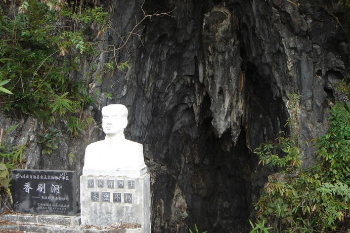 香刷洞位于西山鄉(xiāng)弄列村東北部的一座半山坡上,香刷洞為石灰?guī)r溶洞,洞口高5米,深10米,寬約6米,洞底型似臥底,洞中一年四季比較干燥,洞內可容納20多人。洞內右側一高處有一平臺,可以臥人,臺左側有一小洞穴可以匍伏出洞外。民國21年間(1932年)10月19日晚,堅持在右江斗爭的中國工農紅軍獨立第三師師長韋拔群在戰(zhàn)略轉移中隱藏在此洞中,不幸被叛徒韋昂殺害,犧牲時僅38歲。香刷洞是巴馬瑤族自治縣縣級重點文物保護單位。