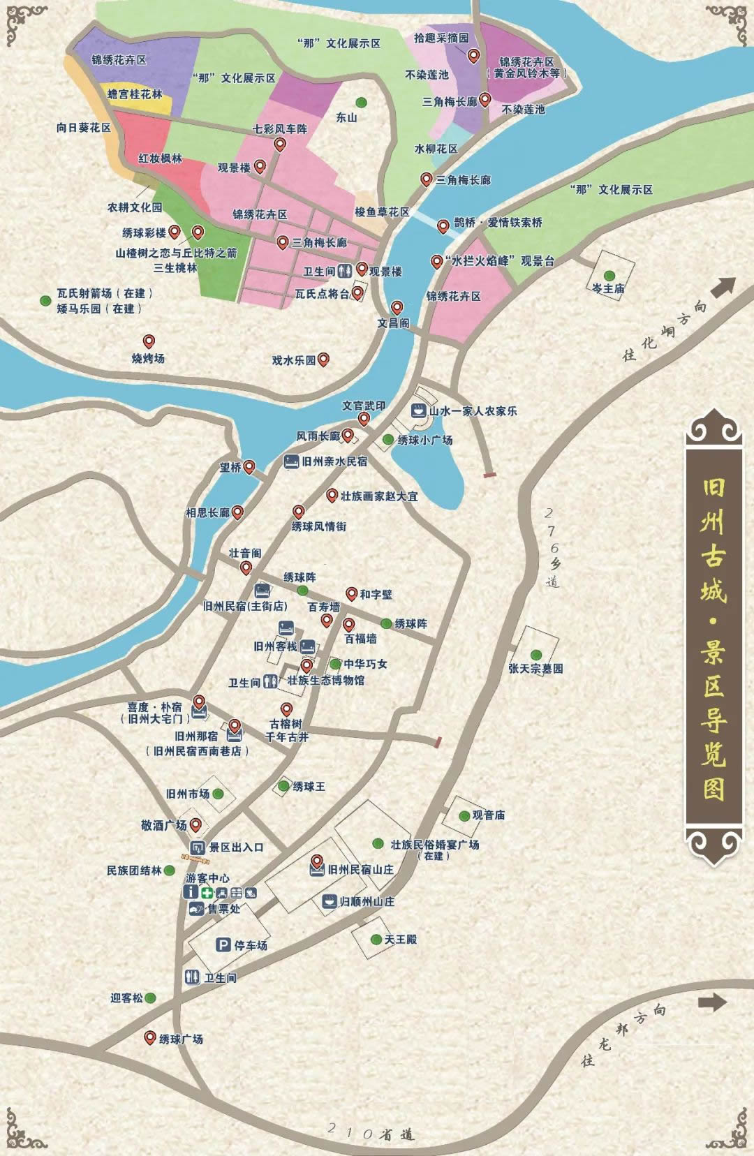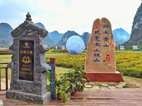 早在一千多年前,舊州古城就作為歸順州(靖西古名)的州府,一直是中越邊境線上重要的政治門戶、經(jīng)貿(mào)樞紐、文化中心和軍事要塞,是當之無愧的“千年古城”,也是名揚四海的抗倭民族巾幗英雄瓦氏夫人的故鄉(xiāng)。舊州風(fēng)光旖旎,景區(qū)的文物勝跡甚豐,有文昌閣、瓦氏夫人點將臺、繡球風(fēng)情街、壯音閣、千畝錦繡花海、望橋、明清時代建筑岑氏土司廟、張?zhí)熳谀箞@等景觀。舊州風(fēng)光是靖西田園風(fēng)光的縮影,吸納了靖西近千年古樸典雅的文化底蘊,將自然景觀和人文薈萃融為一體。