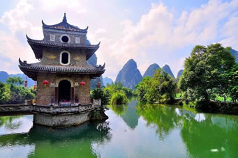 文昌閣位于舊州古城大門以東約1公里,閣建于鵝泉河中的小島上,是—座四角型三層高的古閣,坐東朝西,閣高約15米,閣底面積約16平方米,其中二層、三層均有圓窗,可供游客眺望四面田園風(fēng)光。