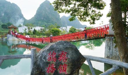 “情定舊州,霧鎖鵲橋”的典故源于“水攔火焰峰”的民間傳說——相傳,舊州古時候有一座老藤橋,是村民外出勞作的必經(jīng)之路,常有喜鵲聚集在兩旁的樹上嬉鬧。
