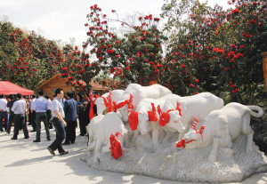 金坡祭祀花神主題園,這里神奇古怪的雕刻,講述了遠(yuǎn)古的彝山人祭祀花神的傳統(tǒng)習(xí)俗,展現(xiàn)了從古至今這里各族人民崇拜花神,敬供花神,祭祀花神的生動(dòng)傳承寫照,高處有花神瑪依魯?shù)膲唬磺坝芯欧N絢麗不同的顏色的杜鵑花,壇前有三牲祭祀貢品。有擊鼓手在擊鼓,旁有千里眼、順風(fēng)耳在觀察東西南北天象,聽聞四面八方民情。