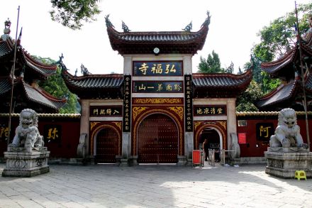 弘福寺為全國重點開放寺廟之一。清康熙十一年(1672年)由赤松和尚創(chuàng)建。“弘!倍帜恕昂敕鸫笤,救人求世,福我眾生,善始善終”之意。沿九曲徑,經(jīng)二十四拐,可抵達弘福寺。弘福寺主要建筑有法化塔、九龍壁、大山門、鐘鼓樓、天王殿、觀音殿、大雄寶殿、玉佛殿、藏經(jīng)樓、說法堂、客堂、雙桂樓及方丈苑;有碑廊、素香齋、五觀堂和五百羅漢堂等大小建筑72座,加上放生池與茶樓等處,占地近11433平方米。徑旁摩崖石刻不絕,其中“虎”字高6米余,題名岱山趙德昌書,實為清著名書畫家孫清彥(竹雅)代筆。寺后象王嶺望城臺上(海拔1270米),建有“瞰筑亭”(1986年春劉海粟大師親書)。