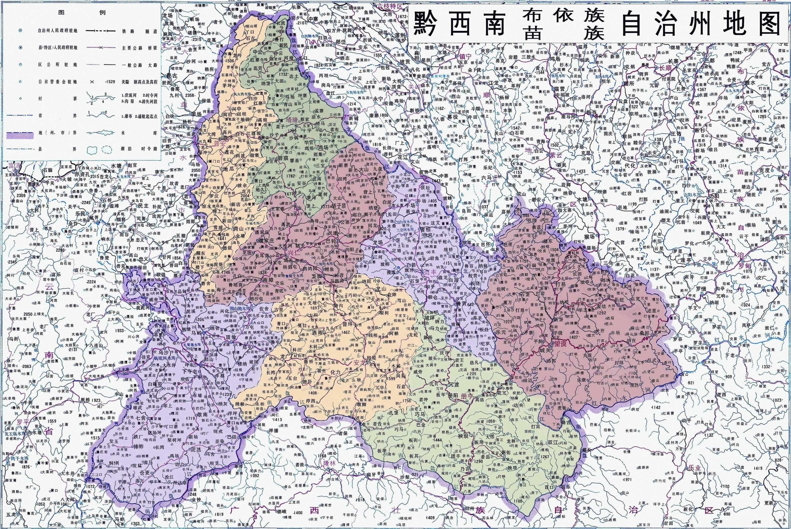 1956年,安龍、冊亨、望謨、貞豐等4縣劃入黔南州,1956年7月18日,撤銷興義專署,所轄興義、興仁、盤縣、普安、關(guān)嶺、晴隆等6個縣劃歸安順專署。1965年1月13日,經(jīng)中央人民政府批準(zhǔn),撤銷貞豐、望謨、安龍、冊亨縣,分別成立貞豐、望謨、安龍布依族苗族自治縣和冊亨布依族自治縣。