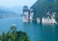 銅仁城區(qū)為錦江分而為三,三鎮(zhèn)之間眾多橋梁點(diǎn)綴,似長虹臥波,又如新月出岫。錦江支流大小江交匯處,水面寬闊,碧藍(lán)如鏡,江心一巨石突兀而起,尤如中流砥柱,為市內(nèi)一大自然奇觀