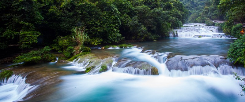 水上森林,長(zhǎng)約600米,分上下兩段。河谷里叢生著茂密的喬木和灌木,形成一道翡翠屏障。清澈的河水從河床的雜木林中穿涌而下。年復(fù)一年,日復(fù)一日的沖涮,河床已沒有了一粒泥沙,連磐石也被激流磨光了棱角而變得“圓滑”,樹木卻扎根在河床里,紋絲不動(dòng),四季常青。是“水在石上淌,樹在水中長(zhǎng)”的奇景。