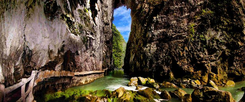 鴛鴦湖是小七孔一奇景,湖水如油,碧綠而凝重。因湖中有兩棵并排參天的大樹而得名,這兩棵大樹半截在水中,枝葉則在上方交握,雌樹纖巧,雄樹則兩三人才能環(huán)抱過來,雄壯挺拔。湖面幽靜,水道四通八達(dá)。