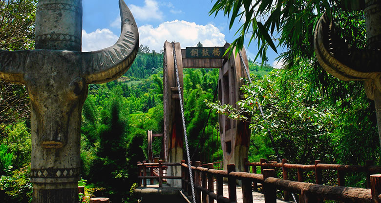 橋長(zhǎng)126米,凈跨60米,寬2.4米,高25米,橋身兩端采用瑤山瑤族銅鼓造型,瑤族將銅鼓視為神賜之物,鎮(zhèn)寨之寶,是權(quán)力的象征。橋頭設(shè)立的圖騰柱代表著瑤族的尊嚴(yán)和崇拜,柱身上的浮雕圖案展示了瑤族傳統(tǒng)、獨(dú)特而古老的民族文化,具有濃郁的地方民族特色。