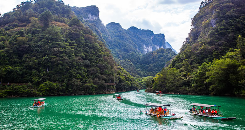 乘橡皮舟順?biāo)従彾,兩岸是蔥茸秀麗的喀斯特原始植被,幽靜的河水中,時(shí)而有魚兒躍起,時(shí)而有秀美島嶼出現(xiàn),宛如精巧的天然盆景。山水含情天做媒,帶著情侶竊竊私語(yǔ),帶著老伴同舟共濟(jì),帶著朋友戲水歡歌。