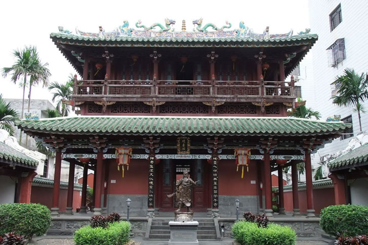 府城鼓樓位于府城鼓樓街,原名譙樓,又稱文明樓。始建于明洪武五年(1372年),明清兩代多次重修。臺基為明成化十七年(1481年)擴建而成,長28米,寬24米,高6.39米。兩拱門,寬4.6米,高7.1米,門額分刻“海南壯觀”、“奇甸文明”。現(xiàn)存鼓樓為清乾隆五十三年(1788年)重修,坐北朝南,面闊五間19.9米,進深三間9.95米,高7.56米,歇山頂,脊飾二龍朝日。樓內原有明正統(tǒng)元年(1436年)銅禁鐘一口,鐘銘記述了捐資鑄鐘情況及祈求國泰民安之意,現(xiàn)存五公祠。