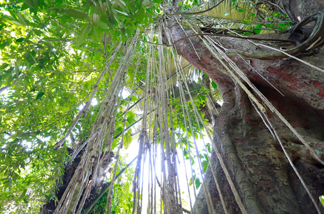 在呀諾達(dá)的雨林谷中,一根根、一條條的藤本植物交叉在一起,盤根錯(cuò)節(jié),密如蛛網(wǎng),其間分布的幾株榕樹,如“定海神針”般地插在其中。