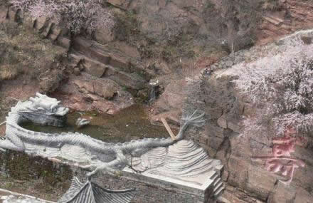 老龍?zhí)队升垖m瀑布鑿蝕而成,潭周邊人工雕筑的巨龍,表現(xiàn)手法抽象,像長(zhǎng)在崖壁上的一條巖脈,騰云飛舞氣勢(shì)磅礴。