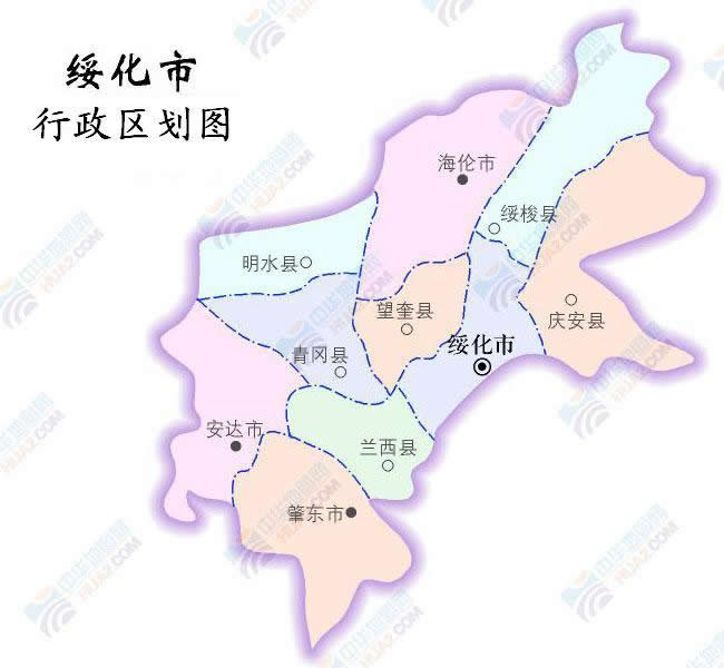安達(dá)市 面積3586平方千米,人口347584,政府駐安達(dá)鎮(zhèn),下轄4個街道、13個鎮(zhèn)、1個鄉(xiāng)