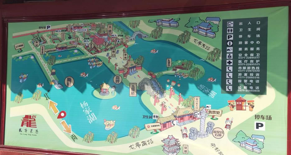 占地面積1300多畝,其中水域面積710畝。全園包括午門、玉帶橋、朝門、照壁、朝房、龍亭公園、北宋皇宮宸拱門遺址、碑亭、北門及東門等清朝萬壽宮建筑群體,還有潘楊二湖、春園、盆景園、號稱中原一絕的植物造型園及長廊水榭等園林景觀。龍亭公園大殿高26.7米,基高13米,坐北朝南。東西兩側(cè)各有八間朝房,與大殿組成完整的宮殿院落,其內(nèi)建有中國首座大型宋代蠟像館,63個人物蠟像形神兼?zhèn),栩栩如生。御道兩?cè)為著名的楊湖和潘湖。雖然兩湖東西相鄰,但楊湖清澈見底,恰似北宋名臣楊繼業(yè)的光明磊落,潘湖卻渾濁不堪,正如北宋奸臣潘美的卑鄙齷齪。整個園區(qū)既有北方宮殿雄渾之氣魄,又兼南國園林秀麗之風(fēng)姿。