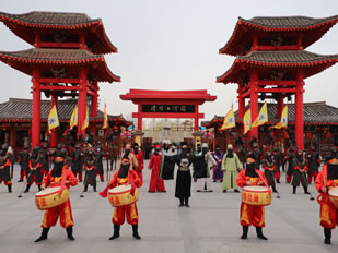 迎賓門是清明上河園的東大門,與之對(duì)應(yīng)的西門稱為金水門。迎賓門位于龍亭湖區(qū)域中心位置。每天上午9點(diǎn)清明上河園開園迎賓,故稱迎賓門。