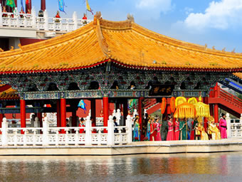 八闋經(jīng)典宋詞和一幅《清明上河圖》串聯(lián)的畫面,將精心選擇的北宋印象包含進(jìn)去,以喚起一個(gè)民族對(duì)興衰的思考和渴望崛起的激情!洞笏巍|京夢(mèng)華》實(shí)景演出選擇在清明上河園皇家園林區(qū)的景龍湖上,充分利用了亭臺(tái)樓榭、水榭橋廊,構(gòu)成了一個(gè)完整的古典實(shí)景劇場(chǎng)。