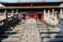 峻極殿前筑有3米高的月臺(tái),周圍有石雕欄桿,月臺(tái)正面有三道石階。中間的臺(tái)階分二路,二路間鑲有垂帶式“御路”一石,上面浮雕著精美的圖案,上截為“獨(dú)龍盤踞”,中間為“雙龍戲珠”,下邊為“群鶴鬧蓮”等紋飾。月臺(tái)下面為拜臺(tái),左右為兩座秀麗的御碑亭,兩亭均為重檐八角,東為“御捍亭”,內(nèi)立清乾隆十五年(1750年)的御碑,西為“御帛亭”,內(nèi)立清乾隆四十八年(1783年)的御碑,其字乃草書。