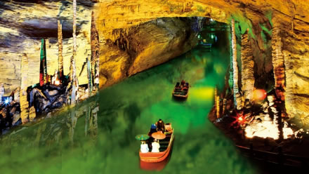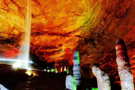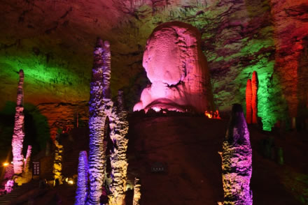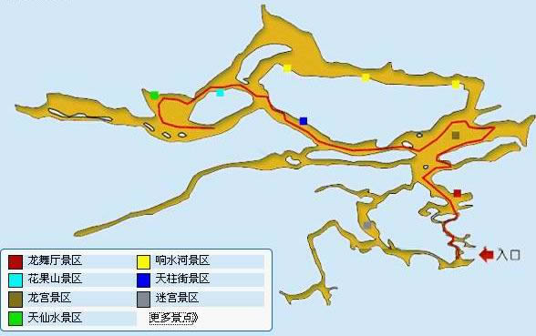 黃龍洞以立體的洞穴結(jié)構(gòu),龐大的洞穴空間,寬闊的廳堂及數(shù)以萬計的石筍,高大的洞穴瀑布,水陸兼?zhèn)涞挠斡[線等優(yōu)勢構(gòu)成了極具特色的游覽洞穴,洞內(nèi)有1庫、2河、3潭、4瀑、13大廳、98廊,以及幾十座山峰,上千個白玉池和近萬根石筍。由石灰質(zhì)溶液凝結(jié)而成的石鐘乳、石筍、石柱、石花、石幔、石枝、石管、石珍珠、石珊瑚等遍布其中,無所不奇,無奇不有,仿佛一座神奇的地下“魔宮”。黃龍洞現(xiàn)已開放有龍舞廳、響水河、天柱街、天仙瀑、龍宮等6大游覽區(qū),主要景觀有定海神針、萬年雪松、龍王寶座、火箭升空、花果山、天仙瀑布、海螺吹天、雙門迎賓、滄海桑田、黃土高坡等100多個。
