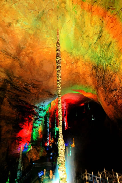 雪松是龍宮的第三大奇觀,也是黃龍洞內(nèi)生長速度最快的一根石筍,它通體雪白,高達17米,巍然聳立在龍宮大廳西端的斜坡上,“大雪壓青松,青松挺且直”就是它的真實寫照!把┧伞钡目茖W名稱叫棕櫚狀石筍,是洞頂?shù)嗡捌洚a(chǎn)生的飛濺水共同作用的結(jié)果,一般只有在空間較為高大的廳堂才能看到。根據(jù)其根部的棕櫚片取樣分析,“雪松”挺立在這里已經(jīng)有9.6萬年的時間了,因此也叫它“萬歲松”。