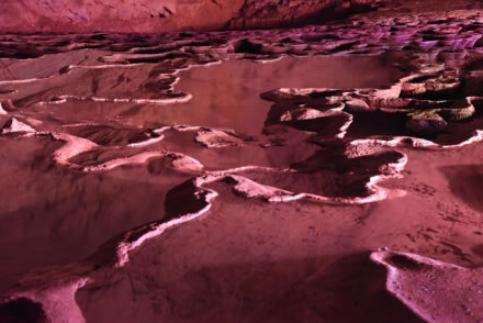 千丘田科學名稱為“流石壩”,也叫“酸田”, 它是水平流動的水在洞底流動過程中形成的碳酸鈣沉積。黃龍洞內(nèi)大大小小的千丘田不計其數(shù),縱橫阡陌,形似一片片頗為壯觀的田園風光。