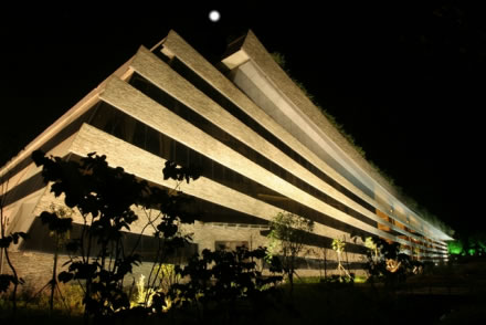 黃龍音樂廳位于生態(tài)廣場入口處,由黃龍洞投資股份有限公司按國際標準建設(shè),建筑面積為4970平方米,總投資1.6億元,座位818個。該音樂廳背靠植被茂盛的黃龍洞山體,面朝浩瀚的稻田,南鄰潺潺東流的索溪水。整個建筑為框剪式結(jié)構(gòu),3250平方米斜坡面屋頂全部為綠茵花草屋蓋,是全球最大的綠化屋頂;其外墻由當?shù)厍嗍搸r構(gòu)建成的音符弦線幕墻與自然融合一體,形如一本即將展開等待世人閱讀的張家界文化寶典,又如鑲嵌在張家界的一塊翡翠,被譽為“世界環(huán)境最美音樂廳”。