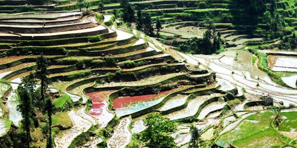 紫鵲界梯田位于新化縣西部山區(qū)水車鎮(zhèn)境內(nèi),她周邊的梯田達(dá)8萬(wàn)余畝以上,其地勢(shì)之高,規(guī)模之大,形態(tài)之美,堪稱世界之最。紫鵲界生態(tài)環(huán)境優(yōu)美,梯田密集,形態(tài)原始,阡陌縱橫,線條流暢,山高水長(zhǎng),板屋交錯(cuò),充分展示出梯田的自然美、古樸美、形體美、文化美。尤其是隨著四季氣候的變化,使紫鵲界梯田更加婀娜多姿,如臨人間仙境。水奉公路盤旋于這些梯田之間達(dá)十余公里,梯田遍布于海拔500米至1000余米的十幾個(gè)山頭上,最大的不過(guò)1畝,最小的只能插幾十蔸禾,連綿起伏,輾轉(zhuǎn)盤旋,可謂是儀態(tài)萬(wàn)方,令人贊嘆不已。據(jù)調(diào)查,紫鵲界梯田成型已有2000余年歷史,是苗、瑤、侗、漢等多民族