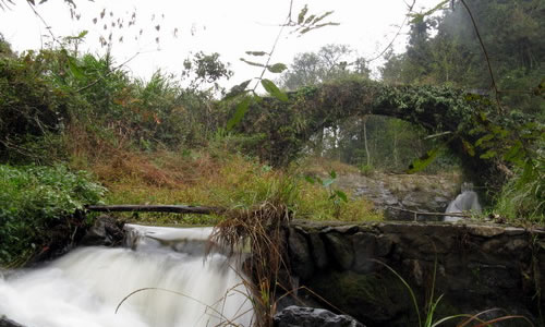 仙人橋景點位于攸縣酒埠江風景區(qū)太陽山景區(qū)漕泊鄉(xiāng)的七里村,屬典型的客斯特地貌,是原有地下石灰?guī)r溶洞在地殼抬升作用下大部分頂蓋塌陷以后,保留下來的一塊頂蓋形成的一座天然石橋。石橋下洞高60余米,橋面長約20米,兩頭窄,中間寬,最窄處僅50厘米左右,最薄處也僅2米。此橋天造地設(shè),鬼斧神工。