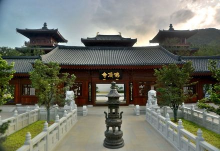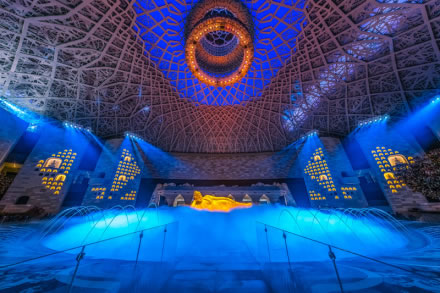 禪境大觀,南北長(zhǎng)112米,東西寬62米,內(nèi)部?jī)舾呒s41.2米,涵蓋了地上三層。整個(gè)空間面積超過(guò)6000㎡,呈橢圓形,以黃、白、灰三色為基調(diào),布置出人間山水,從而讓人們?cè)谛凶咧H領(lǐng)略禪意。由佛陀出生、成道的禪境花園及中間的如蓮劇場(chǎng)三個(gè)部分組成,展現(xiàn)了佛祖一生的行跡。