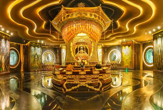 舍利大殿又稱(chēng)佛殿層,距離地面33米,在空間上涵括了地宮第1、2、3層,內(nèi)外又可分為千佛殿與萬(wàn)佛廊,向人們集中呈現(xiàn)了一個(gè)神秘、殊勝的佛國(guó)世界。舍利大塔通高21.8米,由塔剎、塔身、塔座三部分組成,造型靈感來(lái)源于佛教中的須彌山,設(shè)計(jì)采樣于大報(bào)恩寺的鎏金七寶阿育王塔以及敦煌莫高窟的中心塔柱,象征著清凈莊嚴(yán)的華藏世界。大塔塔剎的核心為水晶牟尼寶珠,象征著大日如來(lái)的三昧耶。寶珠下方是頭頂寶珠、口銜瓔珞的大鵬金翅鳥(niǎo),象征著長(zhǎng)壽和忠心。塔身分上下兩個(gè)部分,上部為倒錐形的十三重相輪,象征佛教中的十三天;下部為景泰藍(lán)覆缽,覆缽四周安放著四尊玉雕菩薩像。塔座也分為兩個(gè)部分,上方塔廳呈四方八角形,上面雕刻著金剛杵、法輪、妙音鳥(niǎo)、獅子、圣象、蓮花、卷草、山花蕉葉等佛教吉祥圖案;塔廳四角供奉著四大天王青銅造像。塔座下方是由84片蓮花瓣構(gòu)成的圓形蓮臺(tái),象征佛教的84000法門(mén)。